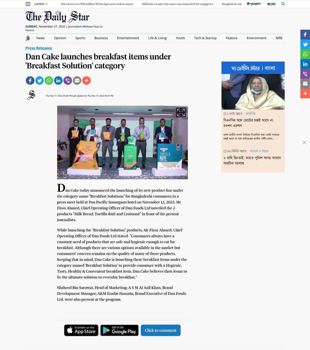 While launching the “Breakfast Solution” products, Mr. Firoz Ahmed, Chief Operating Officer of Dan Foods Ltd stated- “Consumers always have a constant need of products that are safe and hygienic enough to eat for breakfast. Although there are various options available in the market but consumers’ concern remains on the quality of many of those products. Keeping that in mind, Dan Cake is launching these breakfast items under the category named ‘Breakfast Solution’ to provide consumer with a Hygienic, Tasty, Healthy & Convenient breakfast item. Dan Cake believes their items to be the ultimate solution to everyday breakfast.”