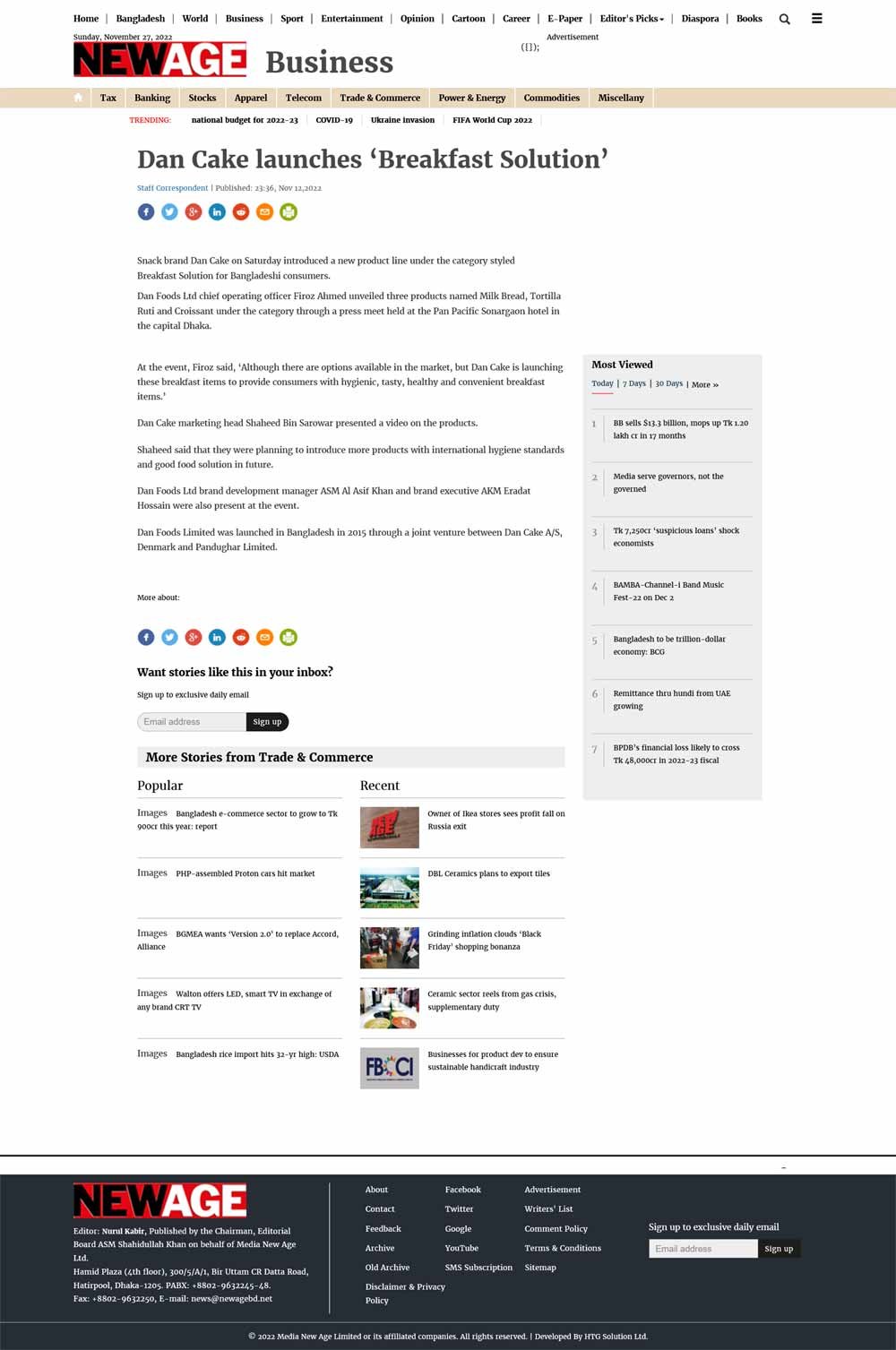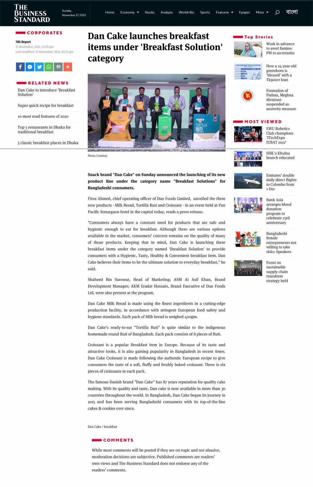 November 12, 2022 (Dhaka): Country’s leading snack brand “Dan Cake” today announced the launching of its new product line under the category name “Breakfast Solutions” for Bangladeshi consumers in a press meet held at Pan Pacific Sonargaon hotel today (November 12, 2022). Mr. Firoz Ahmed, Chief Operating Officer of Dan Foods Ltd unveiled the 3 products “Milk Bread, Tortilla Ruti and Croissant” in front of the present journalists.